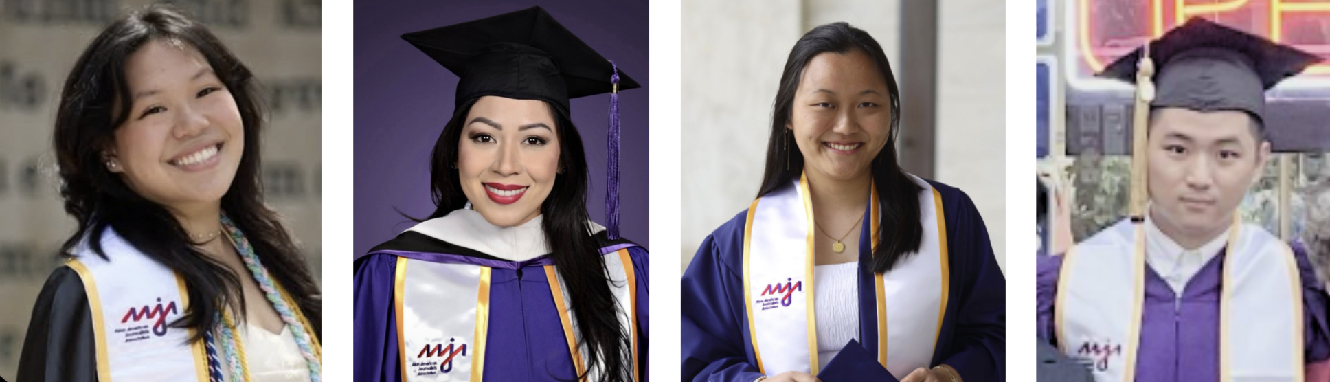 | |  | L-R: Mimi Calhoun, Jannelle Andes, Lily Speredelozzi, and John Beomsoo Kim, showing off their #AAJAFamily pride with AAJA graduation stoles. |