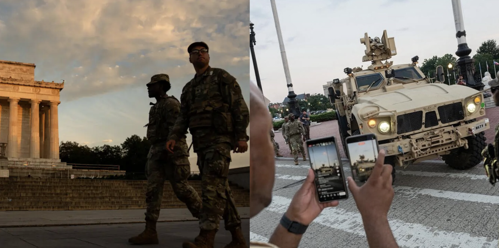| (L-R) Nearly 2,000 National Guard troops and federal agents have been deployed to federal buildings, the National Mall, and Union Station in mid-August, under a "crime emergency" declared by the federal government, despite crime rates remaining near 30-year lows. (Photos by Kent Nishimura / The New York Times and Kaiden Yu / The GW Hatchet) ISSUE HIGHLIGHTS |